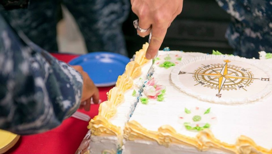 当地时间10月10日,美国海军士兵们切蛋糕提前庆祝福特号航母下水。
