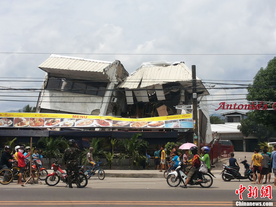 10月15日,菲律宾中部地区发生7.2级地震,灾情持续扩大,菲官方称地震已造成宿务、保和等省份数十人遇难,数百人受伤,大批建筑物受损。图为宿务省省会宿务市的街头,一栋房屋在地震中垮塌。中新社发 翁伟汤 摄
