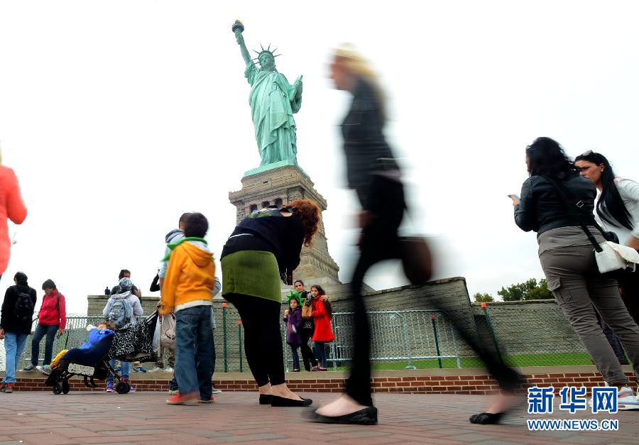 10月16日,游客在纽约自由女神像参观。由于受美国联邦政府关门影响,纽约主要地标之一的自由女神像因缺乏预算一度向游客关闭。纽约州已经与联邦内政部达成协议,以6.16万美元一天,从13日起,纽约州重开自由女神像6天。新华社记者王雷摄