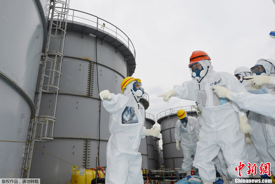 当地时间2013年10月15日,日本福岛,福岛县知事佐藤雄平考察福岛核电站。该核电站在本月初造成核污水泄露,污水流入太平洋。