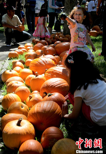 当地时间10月19日,孩子们在休斯敦南瓜节上挑选中意的万圣节南瓜。中新社发 王欢 摄