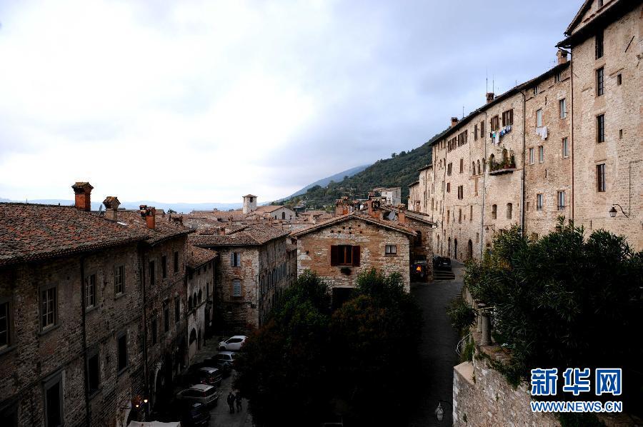 这是10月27日拍摄的意大利古城古比奥古老的建筑及街道。在意大利中部山地大区翁布里亚大区佩鲁贾省,坐落着被意大利人誉为“最美丽中世纪城市”的古比奥,该市依英吉诺山而建,市内街道狭窄、陡峭,遍布建于14至15世纪的深灰色哥特式建筑,整座城市完美地保留了中世纪山地古城的风貌,每年吸引着大量世界各地的游客前来观光。新华社记者许逆之摄