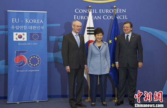 11月8日,韩国总统朴槿惠造访位于比利时首都布鲁塞尔的欧盟总部,拉开了欧盟与东亚三国——中国、日本、韩国的“蜜月”序幕。中新社发