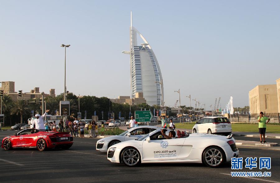 11月8日,阿拉伯联合酋长国迪拜,作为2013年迪拜汽车文化节的“重头戏”,迪拜国际车展8日举行豪车环城大游行活动。布加迪威龙、法拉利、兰博基尼、宾利、劳斯莱斯、玛莎拉蒂等超过500辆世界著名品牌的豪华汽车和摩托车从世界贸易中心转盘出发,进行环城游行。新华社记者 李震 摄 图片来源:新华网