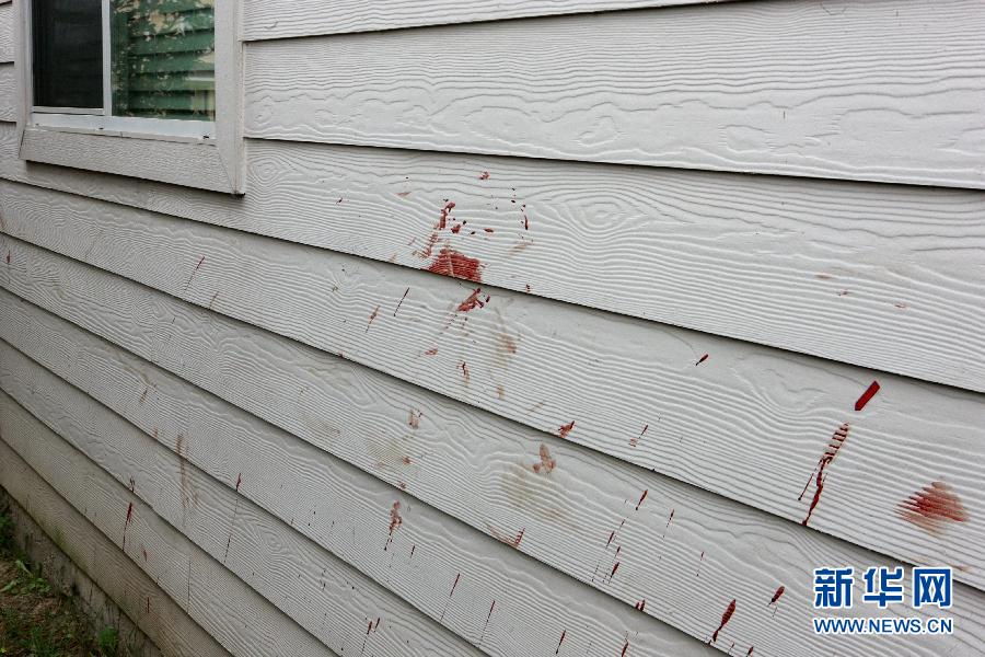 这是11月10日拍摄的发生在美国得克萨斯州休斯敦北郊的一起枪击案的现场留下的血迹。美国警方10日说,美国得克萨斯州9日深夜发生一起严重枪击事件,造成2人死亡、至少22人受伤。 新华社发(宋穹摄)