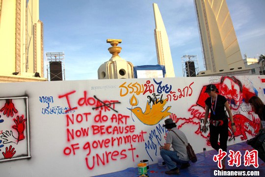 图为有艺术家在民主纪念碑活动现场绘制漫画表达诉求。中新社发 余显伦 摄