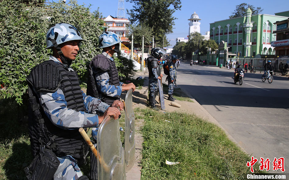 11月11日,尼泊尔警察在首都加德满都街头执勤,严阵以待防范暴力事件。随着11月19日尼泊尔制宪会议选举日益临近,该国反对党11日发起全国性“关闭”行动,学校停课、商店歇业、交通受限。期间,由于出租车及私人机动车被禁止行驶,许多民众被迫徒步出行。尼泊尔反对党称,12日至19日将继续关闭公共交通,以此抵制大选。中新社发 符永康 摄