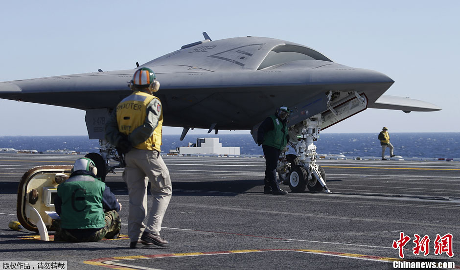 当地时间11月10日,美国弗吉尼亚湾,海军试验型无人舰载机X-47B正从“西奥多·罗斯福”号核动力航母上进行起降测试。据悉此次试飞是为了强化无人机和航母协同行动的效率。