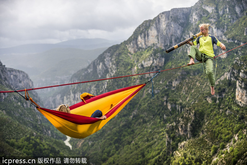 据英国《每日邮报》5月28日报道,法国探险者米奇·凯米特和朋友们在韦尔东河峡谷上方305米处安置了一张仅靠一根安全索链支撑着的吊床,以便他们一边演奏一边欣赏风景。其中阿明·霍尔泽演奏迪吉里杜管,尼科洛·扎拉提尼则弹奏吉他。