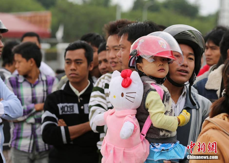 图为12月10日缅甸民众在内比都售票中心排队购票,当地居民通常在面部涂抹防晒用品。中新社发 符永康 摄