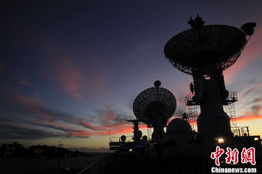 12月11日,夕阳下的斐济苏瓦港口码头,停靠在这里的中国远洋航天测量船“远望6号”与天空中的火烧云、华灯初上的港口相互辉映。中新社发 孙自法 摄