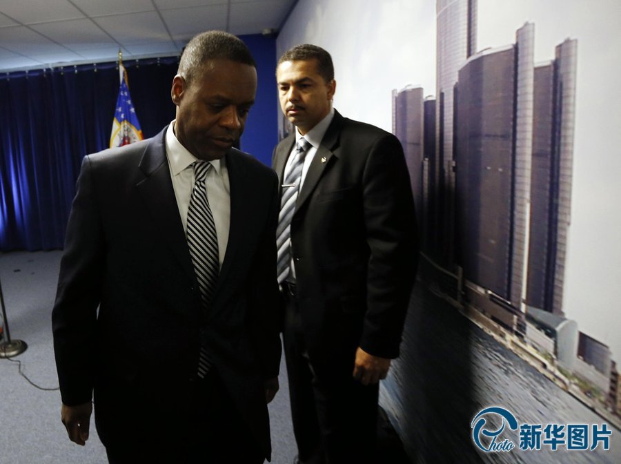 当地时间2013年12月3日,美国底特律应急经理出席新闻发布会。美国联邦法官3日批准了底特律的破产保护申请,称底特律符合美国破产法第九章的破产保护条件,但代价是当地退休人员养老金将被削减。民众在法院外示威抗议。(图片来源:CFP)