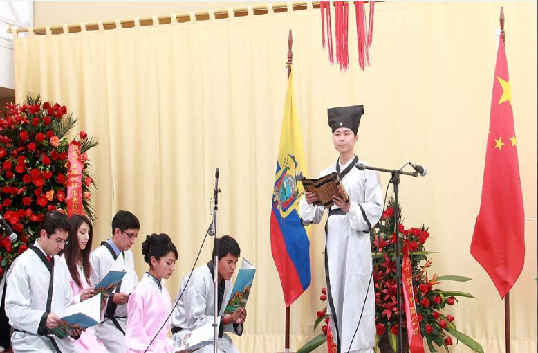 图为11月30日,厄瓜多尔昆巴亚市(Cumbaya)烈日炎炎,在新落成的思源中国语学校孔子课堂揭牌仪式上,几名厄瓜多尔年轻人身着宽大的汉服跪在舞台上表演中文诗朗诵,那份对中国文化的热情比当地气温还“高”。(新华网发 梁君茜摄)
