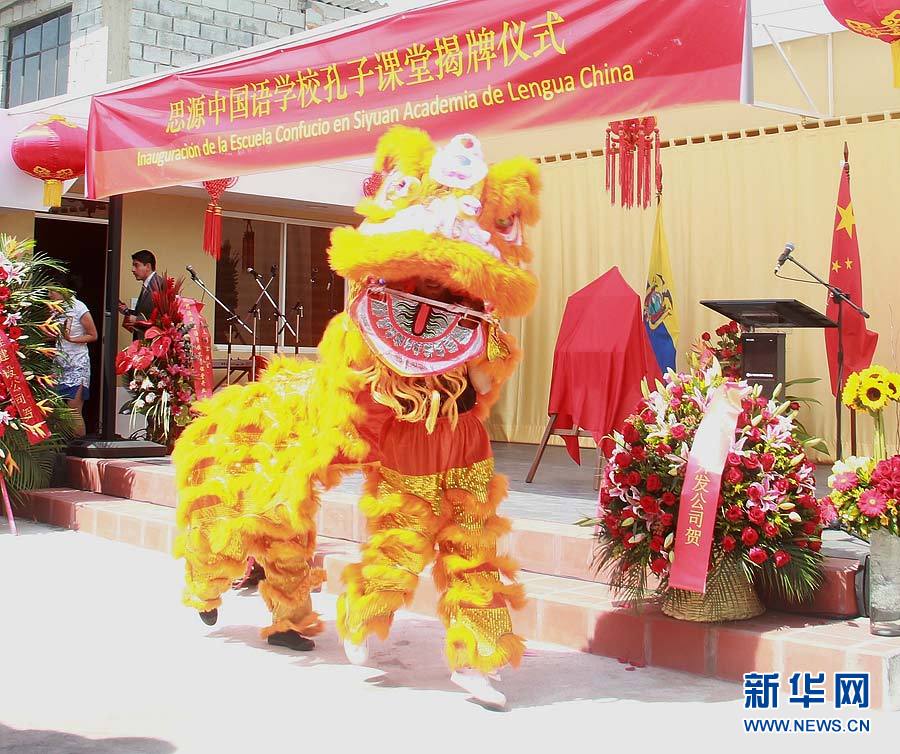 图为11月30日,厄瓜多尔昆巴亚市(Cumbaya)烈日炎炎,在新落成的思源中国语学校孔子课堂揭牌仪式上,几名厄瓜多尔年轻人身着宽大的汉服跪在舞台上表演中文诗朗诵,那份对中国文化的热情比当地气温还“高”。(新华网发 梁君茜摄)