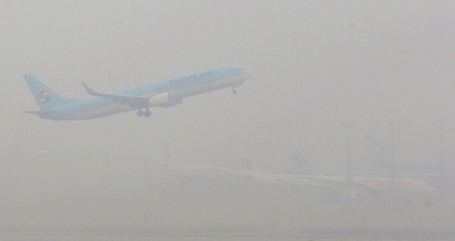 11月5日,韩国仁川机场被雾气环绕,韩媒称来自中国的污染物包围韩国首都圈。图片来源:韩联社