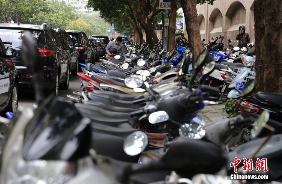 在台湾,摩托车被称为“机车”,不少家庭都是3、4辆,台湾男女老少大多数会骑摩托车。大街小巷,排满了摩托车,密度之高居全球第一。摩托车阵已经成为台湾城镇的一道著名景观,台湾享有“摩托车背上的宝岛”之美誉。图为摩托车阵穿梭在台北街头。中新社发 赵隽 摄