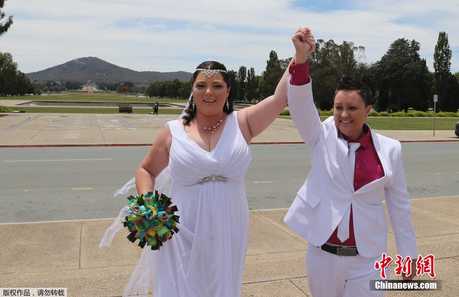 当地时间2013年12月7日,澳大利亚堪培拉,20对同性情侣在堪培拉旧国会大厦举行婚礼。澳大利亚首都领地政府在10月22日通过一项草案,成为澳大利亚第一个同性婚姻合法化的州。澳大利亚高级法院将在12月12日通过同性婚姻合法法案。