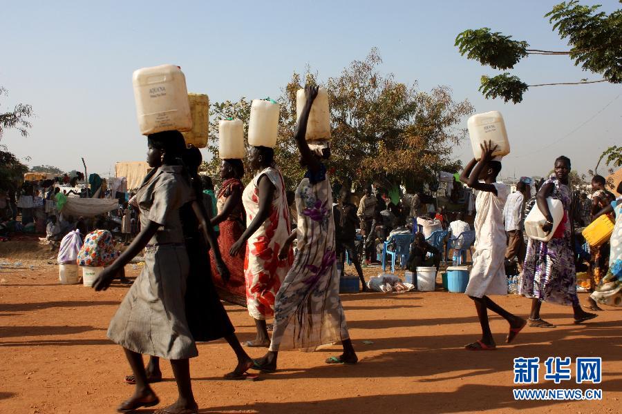 12月22日,在联合国驻南苏丹维和部队位于朱巴的营地,一些南苏丹妇女顶着水桶前往营地内的临时住处。