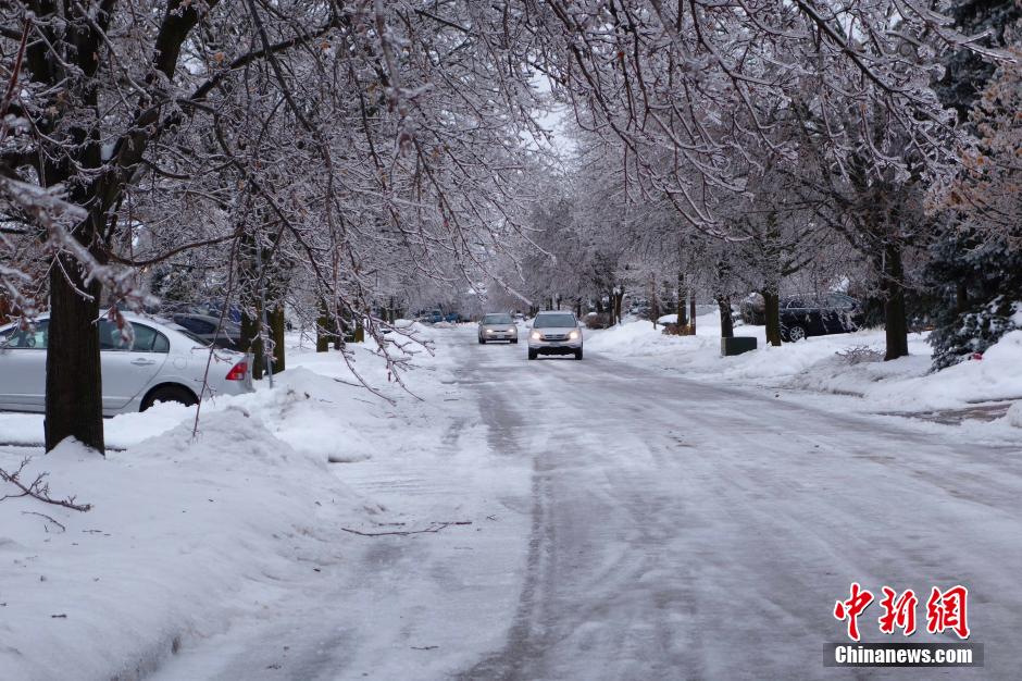 加拿大安大略省南部、魁北克省和东部省份等地,自21日夜开始出现冰冻,并在22日发展成为罕见冰冻灾害。冰冻压垮树木、挂断电线,导致多伦多大停电。多伦多30多万用户受到影响,综合各地数据,受影响用户可能更多。多伦多电力公司称,停电要持续72小时。消息称,部分地区居民可能要在黑暗中度过这个圣诞节。图为图为冰冻导致路面全面结冰,车辆小心行驶。中新社发 徐长安 摄