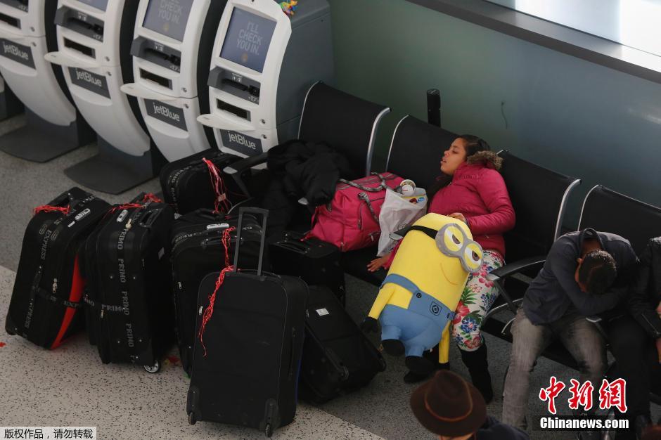 据1月6日报道,强大的北极冷空气席卷美国,并给美国大部地区带来罕见的酷寒天气,多地遭遇20年来创记录低温。全美交通陷入严重混乱,大量航班延误或取消。图为纽约肯尼迪国际机场被滞留的旅客。