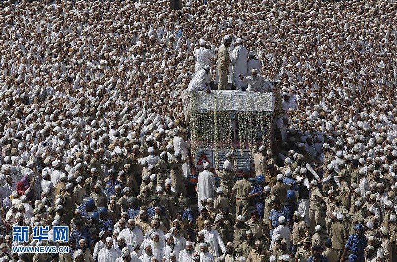 1月18日,在印度孟买,穆斯林围聚在运送精神领袖穆罕默德·布尔汉丁棺柩的车辆旁。印度警方说,18日凌晨,印度最大城市孟买南部吊唁过世穆斯林精神领袖的活动中发生踩踏事故,造成至少18人死亡,50多人受伤。新华社/路透