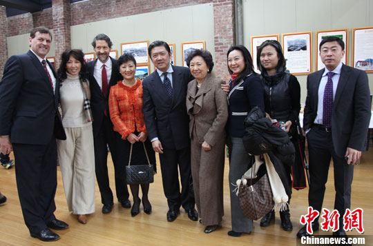 中国歌唱艺术家宋祖英将首次与纽约爱乐乐团合作盛情参演。 图为中国驻纽约副总领事张美芳、著名指挥家余隆、纽约爱乐乐团理事会主席Gary Parr等在新闻发布会后合影。中新社发 阮煜琳 摄