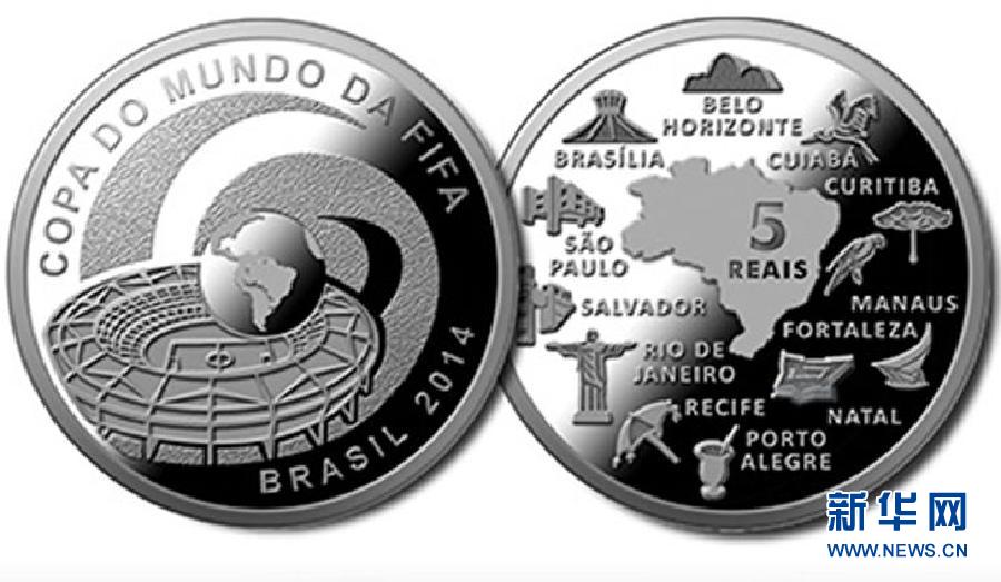 1月29日,巴西中央银行发行第一套世界杯纪念币,全套纪念币共9枚,包括一枚金币、两枚银币和6枚铜镍合金币。其中金币重4.4克,直径1.6厘米,面值10雷亚尔(1美元约合2.4雷亚尔),实际售价1180雷亚尔。金币的发行量预计为5000枚。图为发行的金币样式。金币的一面铸有大力神杯,另一面则为一粒足球攻入网窝的图案。