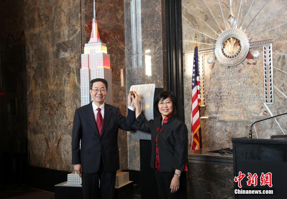 美国当地时间1月29日,美国纽约著名地标性建筑帝国大厦邀请中国驻纽约总领事孙国祥夫妇出席点灯仪式。1月30日晚至31日晚,帝国大厦塔顶将闪耀喜庆的中国红色和金色,欢庆中国马年的到来。   中新网记者   阮煜琳摄