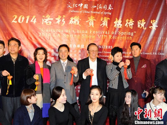 当地时间2月5日,参加“文化中国四海同春”2014洛杉矶新春晚会的演员抵达洛杉矶,董文华等著名歌唱家在当晚举行的招待会上受到当地各界侨胞的热烈欢迎。