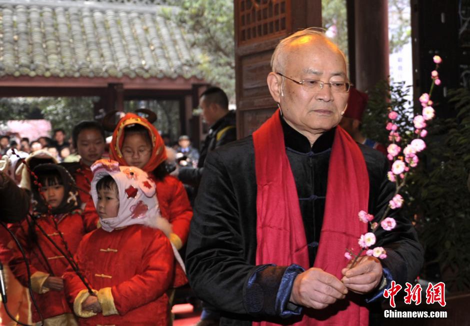 2月6日是农历正月初七,成都杜甫草堂举办甲午年“人日游草堂”祭拜诗圣杜甫活动。手持梅花,庄严肃立的祭祀队伍在盛装仪仗的引领下缓缓步入祭祀主会场。在行过净手之后,主祭人神情肃穆,仪态庄重分别完成了奠帛、诵读祭文等环节,童声诵读的祭文,余音袅袅,犹如天籁,沁人心脾,朝圣队伍和各界群众在音乐的伴奏下向诗人塑像三鞠躬,并和主祭人一起敬献了手中的梅花,以此告慰诗人在天之灵,整个祭祀活动达到了高潮。安源 摄