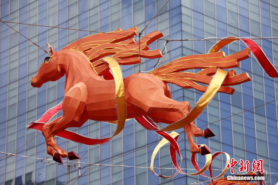 2月12日,马年正月十三,新加坡街头巷尾特别是华人居住区域,马年春节元素仍随处可见。图为市区一条街道上两侧高悬着生动、形象的奔马装饰。孙自法 摄