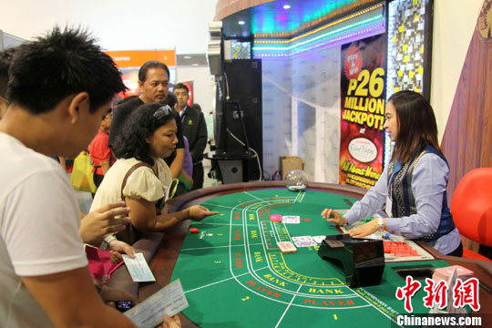 2月14日,第21届菲律宾旅游展览会在菲首都大马尼拉地区帕赛市开幕,吸引大批民众入场。本届旅游展主题定为“爱生活,爱旅行”,为期三天,参展商超过240家,涉及航空、船运、酒店、度假村及旅行社等各类旅游相关企业,是菲律宾有史以来规模最大的一次旅展。图为一家赌场的展台前有民众在试手气。中新社发 张明 摄