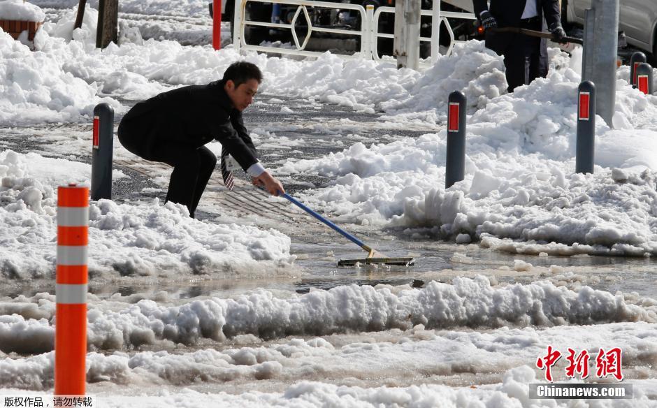 当地时间2014年2月15日,日本关东甲信地区和东北地区暴风雪天气持续,航班、铁路运输以及民众出行受影响,目前风暴已造成3人死亡。图为横滨民众除雪。