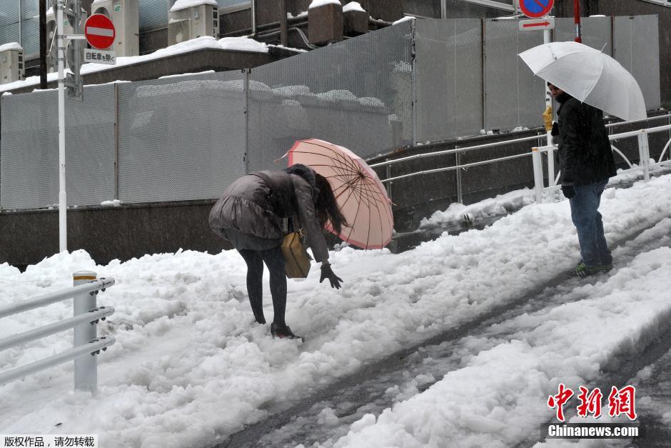 当地时间2014年2月15日,日本关东甲信地区和东北地区暴风雪天气持续,航班、铁路运输以及民众出行受影响,目前风暴已造成3人死亡。图为东京民众路上滑倒。
