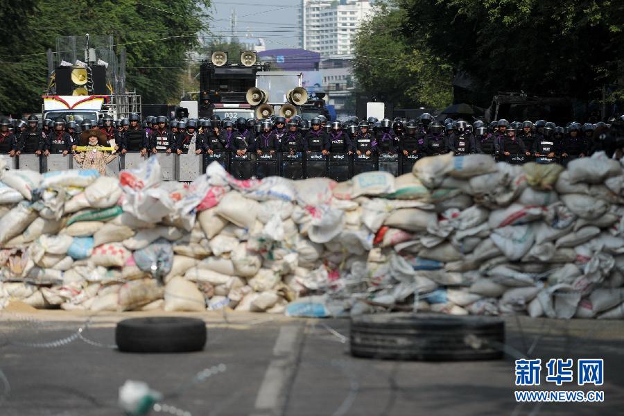 2月18日,在泰国首都曼谷的总理府附近,反政府示威者用铁丝网封锁道路。当日,泰国警方出动2.5万警力,对总理府、民主纪念碑、能源部、内政部、政府综合办公楼等五个地点附近的集会示威者实施驱逐,并疏通交通,以便政府人员尽快恢复正常工作、学校尽快复课。当天的冲突造成警察和示威者共4人死亡、64人受伤。新华社记者高健钧摄