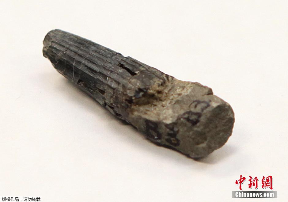 这块长2.3厘米,宽1厘米的恐龙化石是棘龙科恐龙的牙齿。这种恐龙有类似现代长吻鳄的颌部和牙齿,以鱼类为主食。