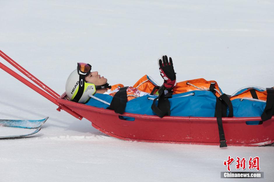 当地时间2月19日,在索契冬奥会高山滑雪男子大回转比赛中受伤的一位运动员被抬下赛场时,向观众挥手致意。中新社发 刘关关 摄
