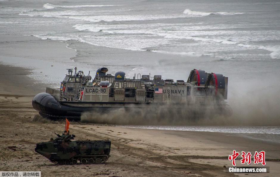 当地时间2月19日,美国加州,美日两国军队在美海军陆战队彭德尔顿营地附近举行“铁拳”联合军演。图为美日海军陆战队举行联合登陆作战演习。