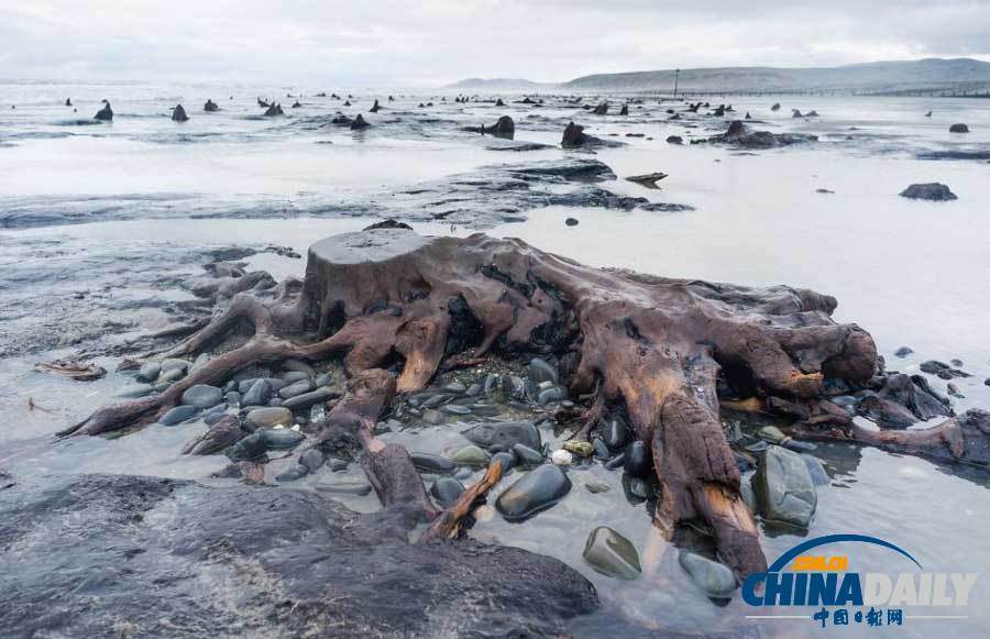 据英国媒体2月20日报道,英国威尔士中部锡尓迪金郡的一个小村庄里,因最近的风暴冲刷了泥土表层,竟意外出土了一片5000年的森林,包括橡树、松树等多种树木。因这里原来是泥沼,这些古木大多保存完好。图片来源:中国日报网