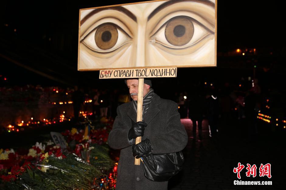 2月23日晚,一名老人在基辅独立广场上手举用乌克兰语写的“人们啊,我正在看你们的事业”的标语牌,缅怀冲突中的死难者。2月20日,乌克兰示威者与防暴警察在独立广场上爆发激烈冲突,造成多人丧生。中新社发 王修君 摄