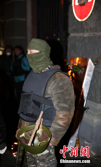2月23日晚,一名戴面具的护卫队队员站在独立广场附近,其后面的盾牌插满了鲜花。乌克兰基辅独立广场上,民众自发组织起来,成立护卫队保证广场及附近地区的安全。中新社发 王修君 摄
