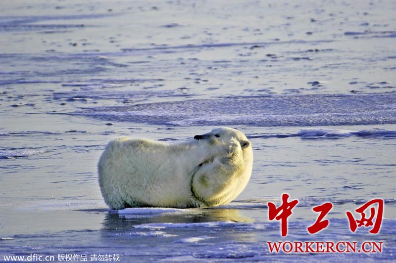 2014年2月25日报道,加拿大哈得逊湾,一只可爱的北极熊仰面躺在冰上,举起双手做伸展运动。这组有趣的照片是67岁的加拿大摄影师兼导游Dennis Minty在工作时拍摄的。