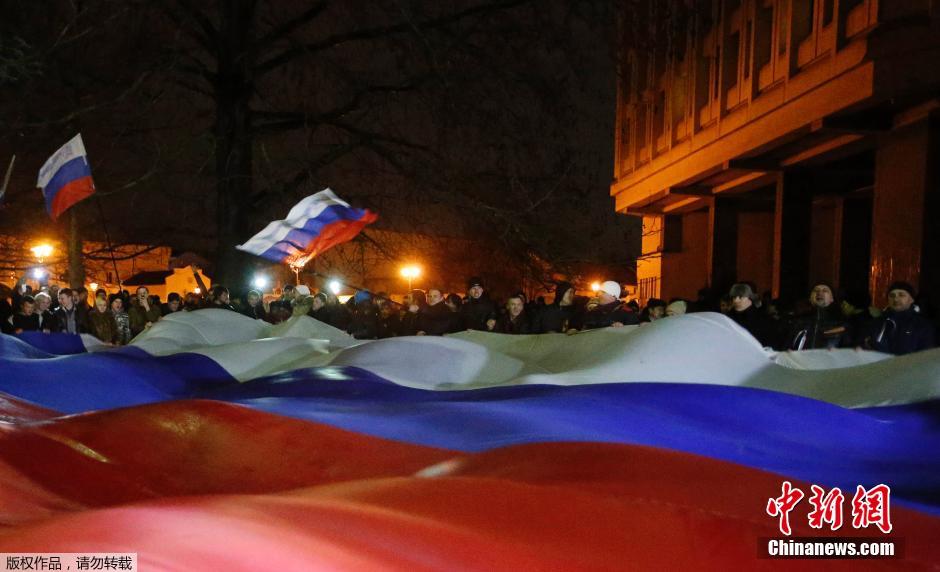 当地时间2014年2月27日,乌克兰辛菲罗波尔,人们拿着巨大的俄罗斯国旗参加支持俄罗斯的集会。据外媒报道,一伙身份不明的武装分子当天占领了乌克兰克里米亚议会和政府大楼,并升起俄罗斯国旗。