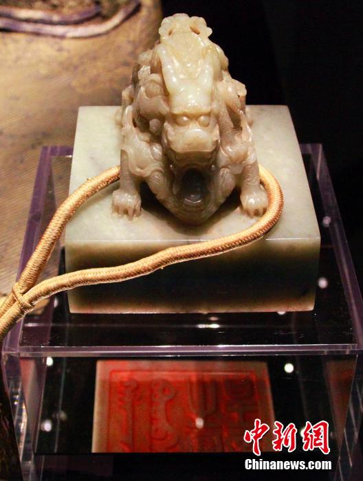 3月5日,由中国故宫博物院与北美第五大博物馆——加拿大皇家安大略博物馆共同举办的“紫垣撷珍—明清宫廷生活文物展”在多伦多开幕。图为展出的玉玺。中新社发 徐长安 摄