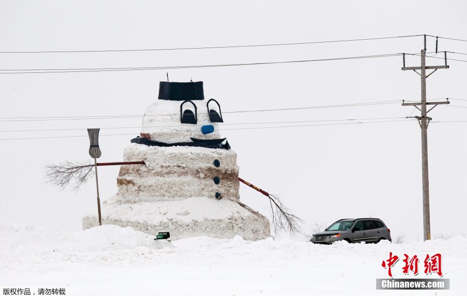 当地时间2014年3月6日,美国明尼苏达州,当地农民格雷格·诺瓦克在去年初冬从自家温室清理出大量积雪,被堆成了高达50英尺(15.24米)的巨型雪人,吸引来往民众驻足观看。