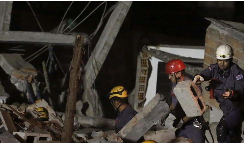 巴西圣保罗郊外爬鲁柳斯(Guarulhos),一栋在建楼房突然倒塌,据消防人员介绍,事发时,在该楼房进行施工作业的13名工人均已经离开建筑,但是尚有一名工人可能还留在建筑内,然而截至目前还没有这名工人的消息。图为救援人员正在废墟中进行搜救工作。