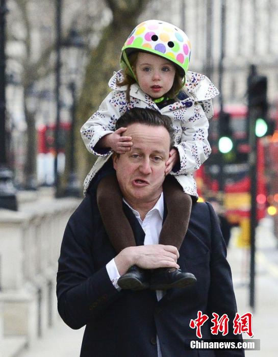 当地时间2014年3月11日,英国伦敦,英国首相卡梅伦送自己的女儿Florence去幼儿园,酷爱滑板车的Florence戴着头盔骑在卡梅伦的肩膀上,萌态十足。图片来源:东方IC