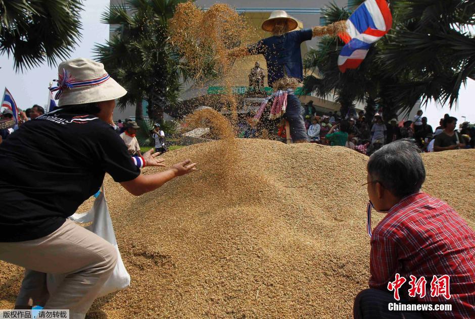当地时间2014年3月11日,泰国曼谷,农民在农业合作社银行前倾倒粮食,抗议政府拖欠购米款项。