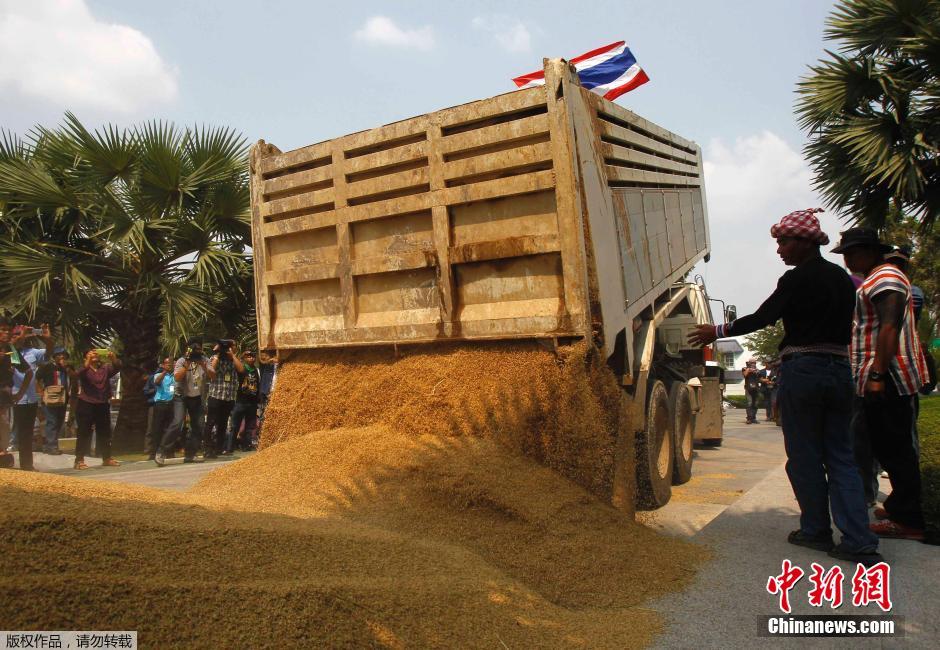 当地时间2014年3月11日,泰国曼谷,农民在农业合作社银行前倾倒粮食,抗议政府拖欠购米款项。