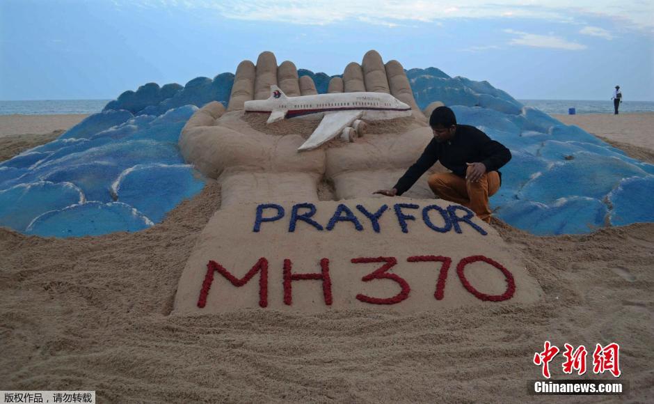 当地时间2014年3月12日,印度布里,艺术家Sudarshan Pattnaik在海滩边打造沙雕,为马航失联航班祈福。